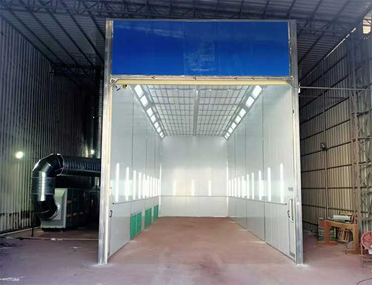 喷漆室:喷漆时具备通风、照明、空气净化,并应具备电源缺相报警、电压过高或过低报警功能。喷漆室采用上部送风,侧部排风的无泵水帘式漆雾处理结构。