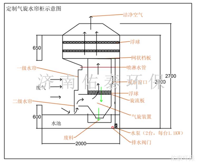 二、气旋式水帘柜采用填料水雾旋转对废气进行净化,适合连续和间歇排放废气的治理,工艺简单,管理、操作及维修相当方便简洁,不会对车间的生产造成任何影响,适合范围非常广泛,可同时净化多种污染物、压降较低、操作弹性大、且具有很好的除尘作用。箱体采用镀锌板喷塑,也可以使用201不锈钢或更高标准的材料制作,持久耐用,填料采用高效、低阻的鲍尔环,可有效去除气体中的异味、有害物质。