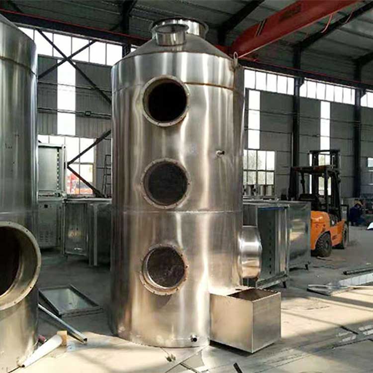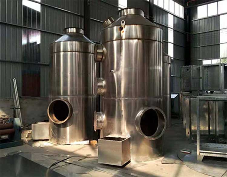 生产设备运行过程中产生的废气通过管道由风机引入不锈钢喷淋塔,在喷淋塔内多级喷淋的混流作用下,废气与塔体喷出的吸收液充分接触。喷漆,SO2和NOx等有机废气被吸收液吸收,而废气和粉尘在离心力的作用下被甩到塔壁,被塔体内壁的水膜粘附,然后随吸收液流入沉淀池,定期清洗。净化后的气体经气体除雾层进行气液分离后,从高空烟囱排入大气。