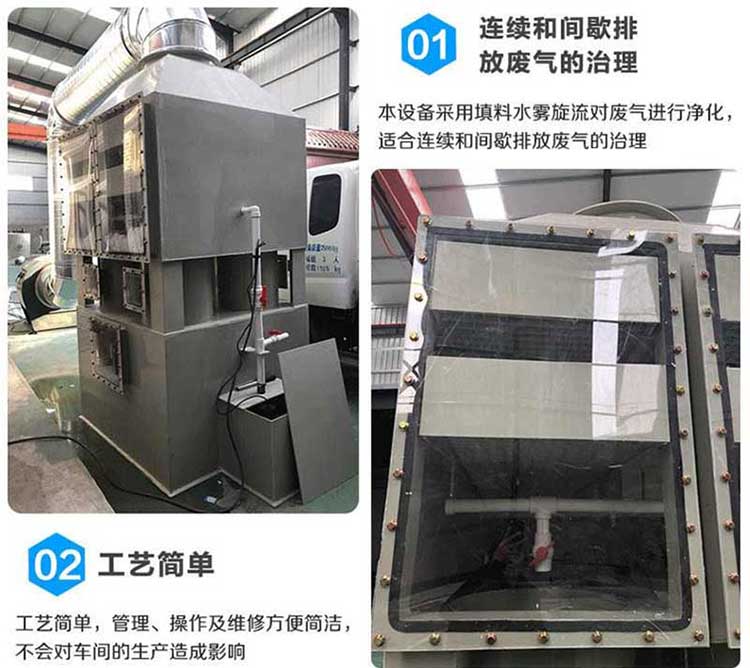需要处理的含尘废气由风管引入净化塔,经过旋流塔洗涤桶时,风带加快,带动填料球飞快运转。在洗涤桶里,含尘废气与水雾充分混合洗涤,中和反应(水里补充有酸碱时)废气经过净化后,再清除雾层脱水除雾后由风机排入大气或再进入其他净化设备(光氧催化、低温等离子等)。吸收液在塔底轻水泵增压后在箱顶喷淋雾化而下,***后回流直箱底循环使用,净化的废气达到国家排放标准
