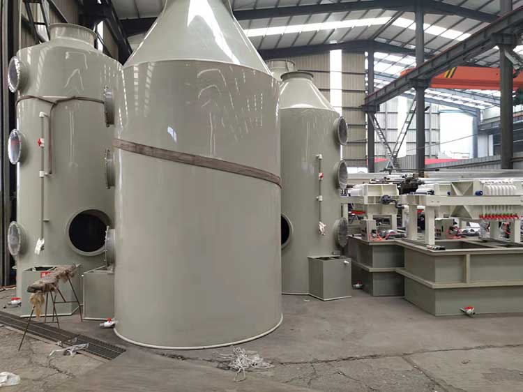 喷淋塔废气处理塔处理废气的方式如下,废气塔在运行中,不断有机气体由风管引入喷淋塔,经过填料层,废气与漆雾凝聚剂的稀释剂进行气液两相充分接触吸收中和反应,有机气体经过净化后,再经除雾板脱水除雾后由风机排入大气。吸收液在塔底经水泵增压后在塔顶喷淋而下,较后回流至塔底循环使用。净化后的有机气体中,漆雾去除率达到95%以上,为后续处理喷漆废气中的甲苯,二甲苯等有机气体提供良好工作条件。