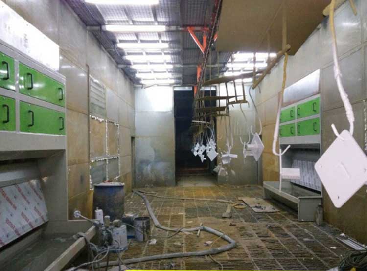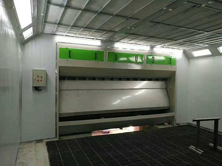 Ø 喷漆室:喷漆时具备通风、照明、空气净化的功能。喷漆室采用上部送风,侧部排风的漆雾处理结构。漆雾处理设备为干式喷漆柜和喷漆水帘柜两种类型。