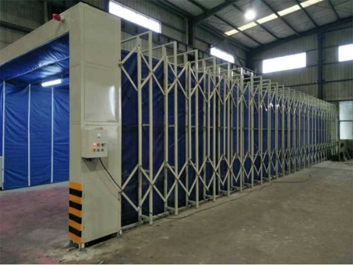 3、伸缩移动喷漆房整体为框架传动结构,每组框架间均有阻燃PVC布密封连接,安装快捷、外形美观,结构精巧,使用方便,制造成本低,节约投资;