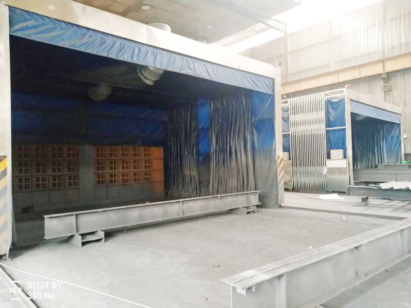 伸缩房整体为钢制框架结构,可前后伸缩移动。框架之间的滑动连接机构框架在驱动装置的带动下沿地面的轨道前后竖直平行移动,同时带动蓬布展开,合拢。移动室收缩合拢时,将工件移入工作区,展开时可进行工件的喷漆或打磨等工作。在不喷漆的工作时间内,可将移动区域合拢,腾出空间场地作为其他与喷漆交叉作业的工序使用。