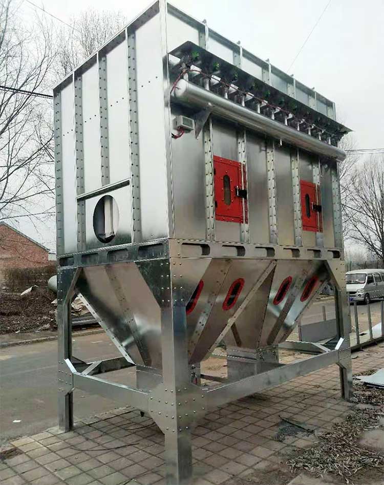 含尘气体在风机的吸力下通过管道进入布袋除尘器过滤室,较粗颗粒直接落入灰斗或灰仓,含尘气体经滤袋过滤,粉尘阻留于袋表,净气经袋口到净气室,由风机排入大气。当滤袋表面的粉尘不断增加,导致设备阻力上升到设定值时,时间继电器(或微差压控制器)输出信号,程控仪开始工作,逐个开启脉冲阀,使压缩空气通过喷口对滤袋进行喷吹清灰,使滤袋突然膨胀,在反向气流的作用下,附于袋表的粉尘迅速脱离滤袋落入灰斗(或灰仓),粉尘由卸灰阀手动或自动排出。
